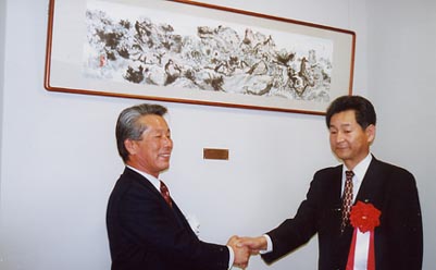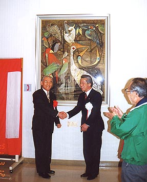 | 倉敷西ライオンズクラブは藤澤人牛先生の日本画と墨彩画を 平成13年3月12日倉敷市と船穂町に寄贈。 地域文化の発展に役立てて下さい、と日本画家藤澤樹(号人牛)氏の作品「鳥」(100号)を倉敷市に寄贈。同市玉島阿賀崎一丁目の玉島文化センター大ホール入り口ロビーに飾られた。倉敷西ライオンズクラブのメンバー等約30人が出席、難波貞敏会長から「多くの市民に見てもらい、地域文化の向上に役立ててほしい」と中田武志市長に目録を手渡した。引き続き作品の除幕が行われた。尚この事業は山陽新聞・玉島テレビ放送等に大きく報道されました。 |