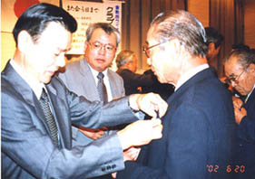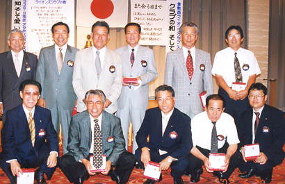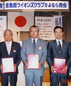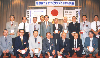 倉敷西ライオンズクラブ(2001/7〜2002/6)サヨナラ例会が行われた。活躍した各役員の表彰があり、次年度役員にバッチ交換・そして楽しい懇親会を行い次期会長の田邊丸に引き継がれた。