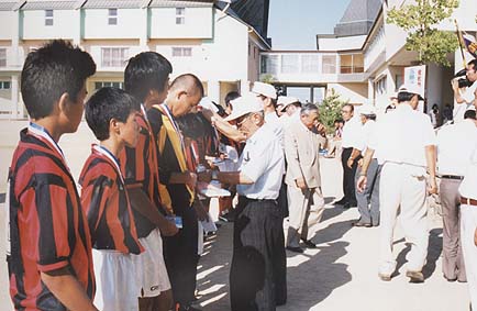 青少年育成事業の一つとして、今年も中学生サッカー大会が、炎天下のなか玉島北中学校グラウンドで、8月11日と12日の二日間にわたり開催されました。市内玉島地区の中学校4校と船穂・金光・鴨方町内の中学校4校の計8チームが参加して、トーナメント方式で試合が行われました。 |