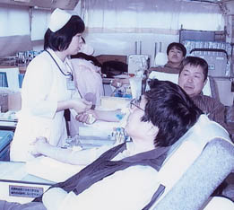 | 午前11時バス2台で鴨方山陽高校の野球部選手30名が善意の献血をしてくれました、後日会長・幹事・献血委員長で山陽高校に礼に行きました。 |