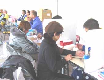 | 受付で説明をするメンバーと献血者 | 緊張顔で採血 |