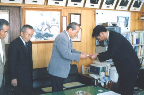 | 25周年記念事業として船穂町長に20万円を渡す渡辺会長(船穂町スポーツ少年団) | |