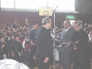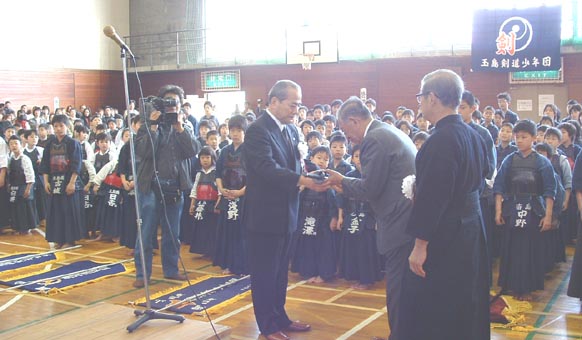 | 玉島剣道少年団をはじめ近辺の7つの団体と2つの中学校が参加して、旧玉島青年の家体育館(倉敷市玉島阿賀崎)で少年剣道大会が行われました。体育館は選手211人と関係者や応援の人を加え500人を超す人たちの熱気であふれんばかりでした。 そんな中、少年少女剣士たちはメェーン、コテェーなどと、随所に気合の入った剣さばきを見せてくれました。とくに女の子が男の子を負かしたときは、大きな拍手が会場からわき上がっていました。また試合に先だって、剣道を題材とした作文を書いてくれた剣士たちの表彰式がありました。「礼儀が身についたこと以上に多くの友達ができたことが僕の財産だ」という内容の作文を書いた岡本君が最優秀賞に選ばれました。なお作文と剣道のおもな結果は下記のとおりです。体育館の外ではライオンズクラブ主催のバザーやうどんの販売も行いました。この売上金はすべて寄付される予定です。みなさんご協力ありがとうございました。 教育市民公衆安全委員長 畑 直彦