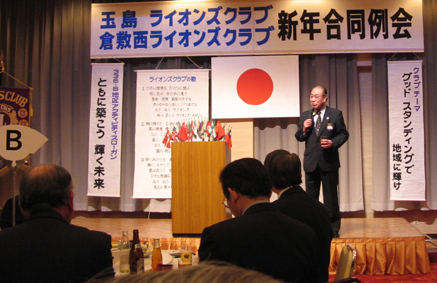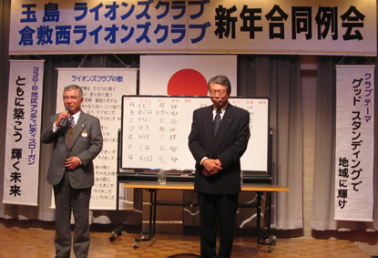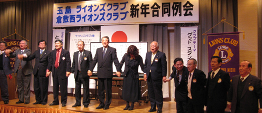| 新年玉島LC・倉敷西LC・合同例会 (玉島LC第1246回・第676回) 平成20年1月24日:セントイン倉敷 3F玉島ライオンズクラブのホストで開催されました。新春にふさわしい(交流の場)懇親会になりました。プロ歌手の生演奏で大変盛り上がりました。 計画委員長 小幡輝夫 |