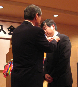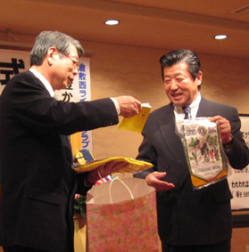 | 渡部会長より7つ道具を受領(高橋・丸本・笠原各氏) | ||