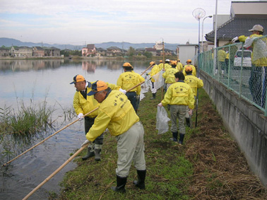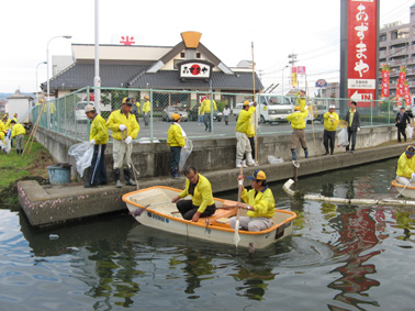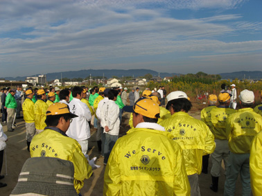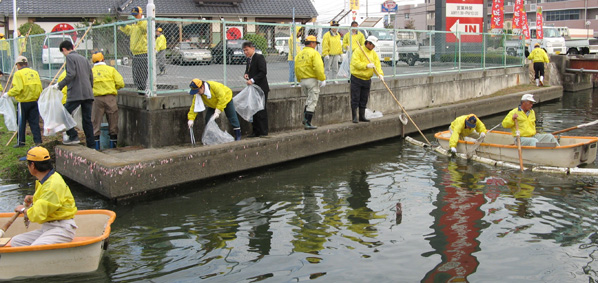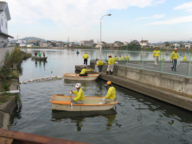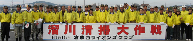 | 平成19年11月4日(日)午前8時から、商工会議所大熊副会頭・兼信環境委員長・「少しずつ溜川もきれいになった」との挨拶に続き「溜川で清掃大作戦」を行いました。 当日は清掃には大変よい秋晴れに恵まれ各種団体から大勢が参加し我が倉敷西ライオンズクラブも48名のメンバーが集合し担当区分の溜川北岸のゴミを分別、清掃しました。周辺は大変きれいになりました。それぞれ行事のある日曜日にもかかわらず清掃奉仕に参加されたメンバーの皆さん、ご協力本当にありがとうございました。