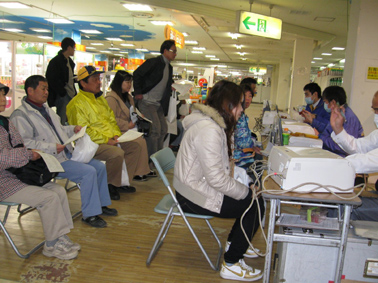 | 血圧測定する献血者 | 小林会長も笑顔で献血 |