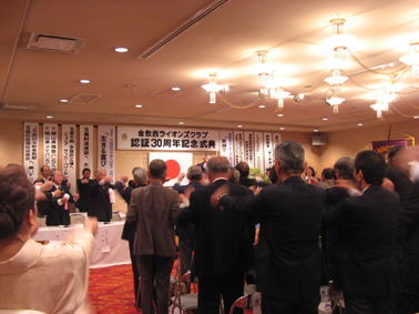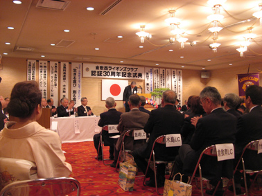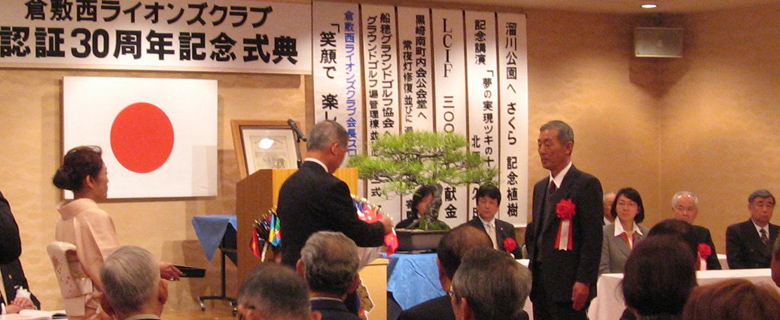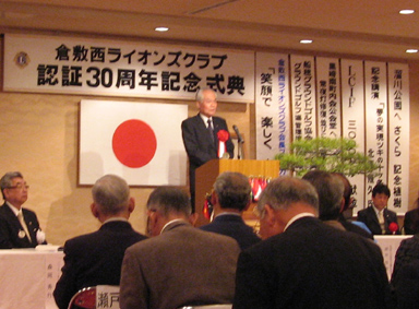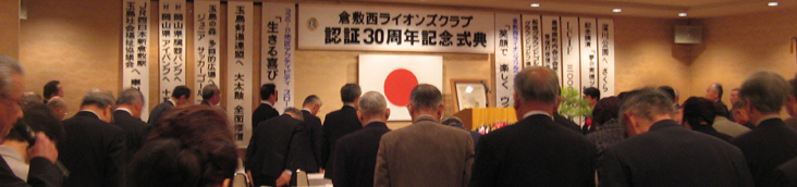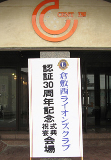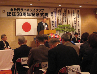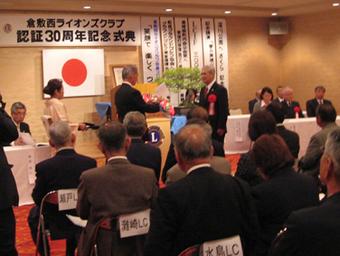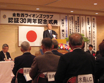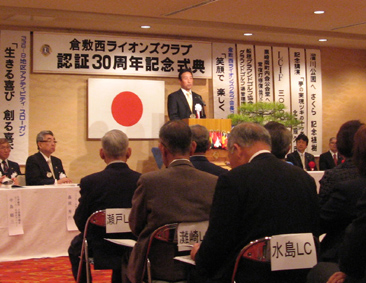 | 2009年4月5日セントイン倉敷において倉敷西ライオンズクラブ認証30周年記念式典及び祝宴が行われた。出席者は一般来賓として伊東倉敷市長・吉川玉島商工会議所会頭他関係者。ライオンズクラブ関係者森岡336B地区ガバナーを祝地区役員・ブラザークラブ会員・総計170名の出席で大変盛り上がりました。以下写真で様子を報告します。 |