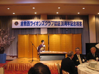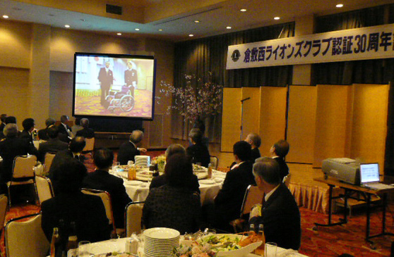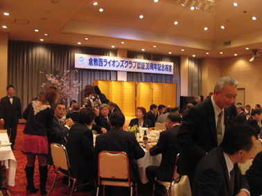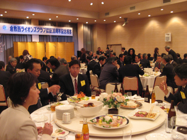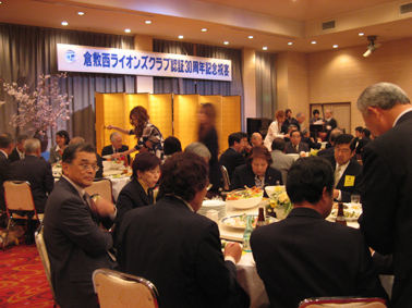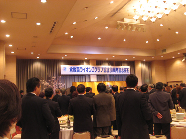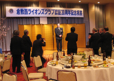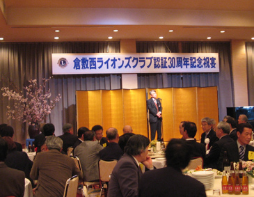 | 2009年4月5日セントイン倉敷において倉敷西ライオンズクラブ認証30周年記念式典及び祝宴が行われた。出席者は一般来賓として伊東倉敷市長・吉川玉島商工会議所会頭他関係者。ライオンズクラブ関係者森岡336B地区ガバナーを祝地区役員・ブラザークラブ会員・総計170名の出席で大変盛り上がりました。以下写真で様子を報告します。 |