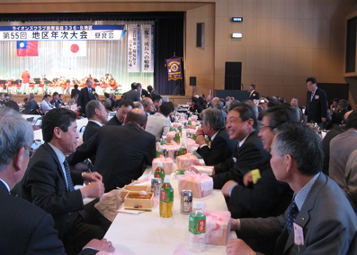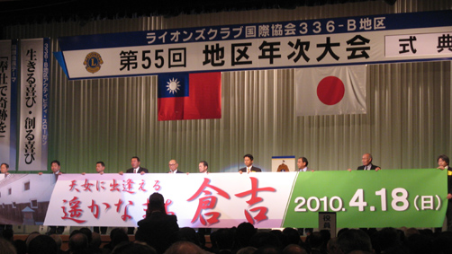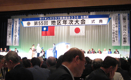 第55回地区年次大会が4月12日津山市体育館で開かれました。 ●336-B地区アクティビティースローガン『生きる喜び・創る喜び』 ●336-B地区ガバナーキーワード『会員増強』『環境保全』『青少年健全育成』のもと1800名に近い岡山、鳥取両県のメンバー並びに、石井岡山県知事、桑山津山市長、名越前国際理事、300-E1地区(台湾)楊 政城ガバナーをお迎えして盛大に開催された。