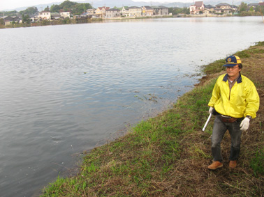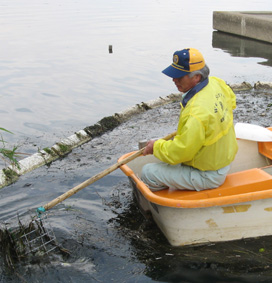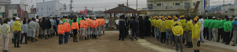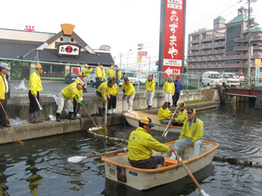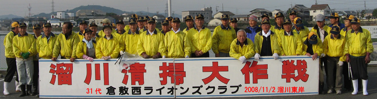 | 平成20年11月2日(日)午前8時から、「溜川清掃大作戦」を行いました。商工会議所・兼信環境委員長・の挨拶で湖水公園が出来上がりつつあります、この公園(我々倉敷西LC30周年記念事業で、来春桜の苗木の植樹予定場所)をどのように管理するか?課題が残りますが玉島の全員でよく話し合い管理体制を整えなくては?の話しがあり、それぞれ担当区分に分散し清掃しました。 当日は秋晴れで各種団体から大勢が参加し我が倉敷西ライオンズクラブも45名のメンバーが集合し担当区分の溜川北岸を清掃しました。周辺は大変きれいになりました。それぞれ行事のある日曜日(釣り部会はその後爽やかな気持ちで釣りに出かけました)にもかかわらず清掃奉仕に参加されたメンバーの皆さん、ご協力本当にありがとうございました。尚当日我がクラブの難波貞敏さんが、EM菌の団子を作り放投し溜川の汚泥の活性化のテストもしました。
