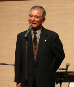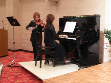 | 家族Xmas会でYE性の紹介 | 乾杯の音頭渡辺勝生さん | 音楽で花を添える作陽大生 |