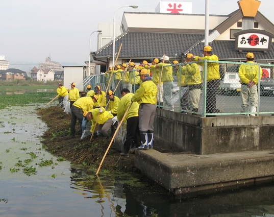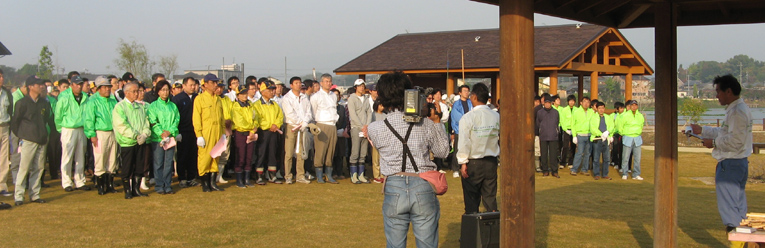 | 平成21年11月1日(日)午前8時から、「溜川清掃大作戦」を行いました。商工会議所・兼信環境委員長・の挨拶で湖水公園が出来上がりました、だるまがえるも生息が確認できるようになりました、とのこと。この公園は我々倉敷西LC30周年記念事業で、桜の苗木を植樹した場所です。今回は岡山大学沖陽子教授のビオトープの話し、そして高陽高校の先生のエコと循環についての話しと生徒が作った菜種の苗の移植をしました。苗の植え付け後、それぞれ担当区分に分散し清掃しました。 当日は秋晴れで各種団体から大勢(約500名近)が参加し我が倉敷西ライオンズクラブも50名のメンバーが集合し担当区分の溜川北岸を清掃しました。周辺は大変きれいになりました。それぞれ行事のある日曜日にもかかわらず清掃奉仕に参加されたメンバーの皆さん、ご協力本当にありがとうございました。
