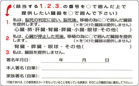 ※意思表示カードは右の画像の表裏をクリックして印刷して免許証等と一緒に保管してください、意思表示は有効です。