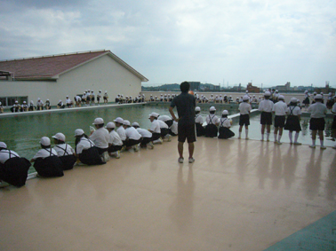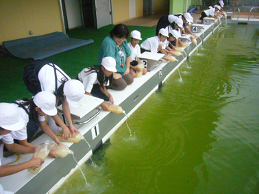 | 投入する児童達 | 投入する児童達(プールの色が濁っています) |