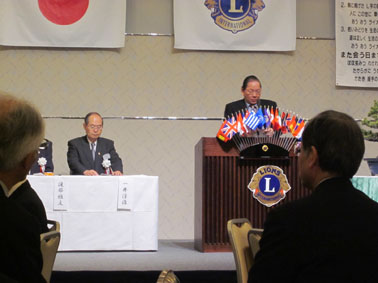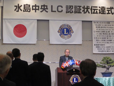 | 認証式で整列する水島中央LC新メンバー | スポンサークラブ水島LC伊藤会長挨拶 |