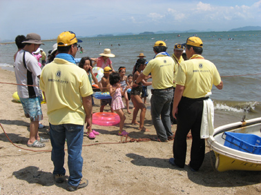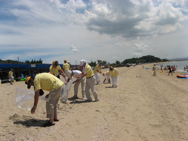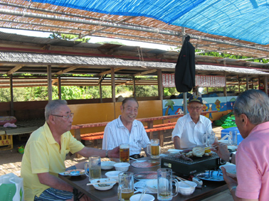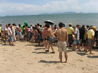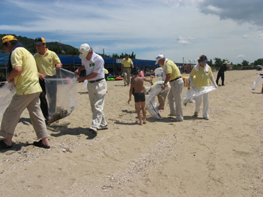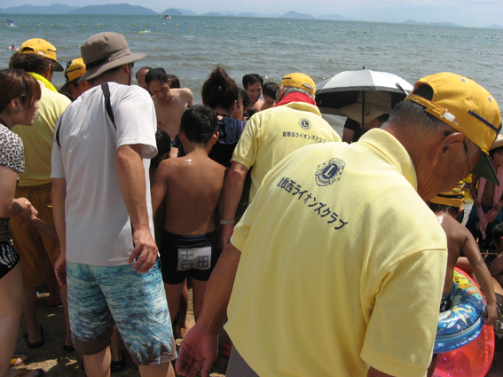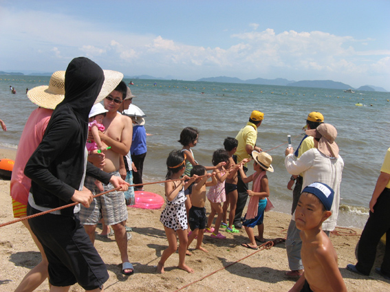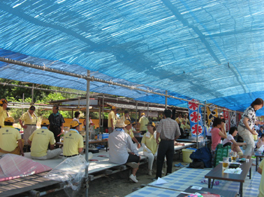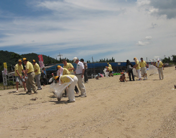 | 平成22年8月7日「沙美海水浴場」で行われました。 田野会長の方針で今年度の納涼例会は沙美海水浴場(はまや)で開催しました。 第737回例会の後、家族全員で沙美海岸の清掃奉仕をして、納涼懇親会を行い大勢の同伴者・家族も参加して楽しい懇親会になりました,、イベントとして西瓜割り・地引網もあり子ども、孫達も大変な喜んだ様子でした。 |