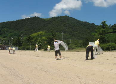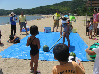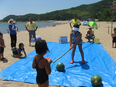 | 清掃後楽しむメンバー | 西瓜割りをする子ども達 | |