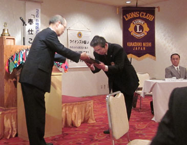 | 我が倉敷西LCはLCIF(東日本震災義援金限定で)に多額な献金1,260,706円をしました。それに対し国際会長より特別表彰され、一井地区ガバナーが伝達に例会訪問され田野会長に渡された。 又玉島北中学校校長並びに担当の先生がライオンズクエスト授業を実施(平成23年5月13日及び17日)報告に例会訪問されました。その報告を聞きに8R-1Z西伯南LC、種 治孝PR委員長が訪問されました。 |