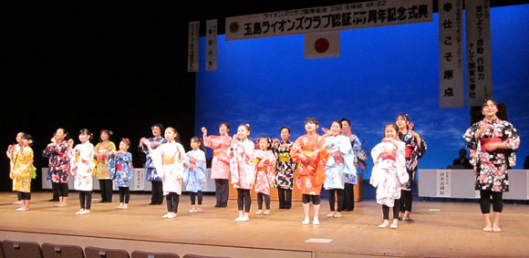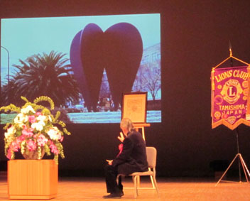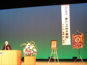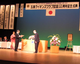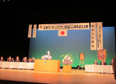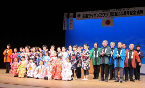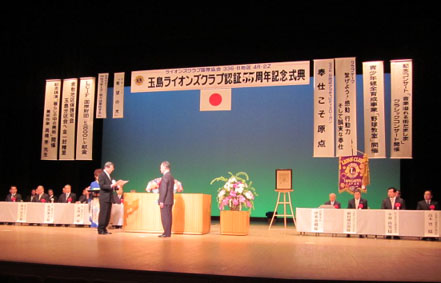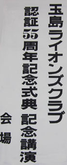 玉島ライオンズクラブ認証55周年記念式典が4月17日「くらしき作陽大学」で行われました、来賓として伊東倉敷市長・玉島ロータリークラブ会長・玉島青年会議所小林理事長・玉島商工会議所青年部会長・くらしき作陽大学学長・玉島保護司会西副会長・玉島テレビ放送藤井社長・ライオンズ関係者は336B地区一井ガバナーを始め柴田元ガバナー他、地区役員並びにブラザークラブの大勢のメンバーが「くらしき作陽大学藤花ホール」に集結しました。東日本大震災の冥福をお祈りし、一日も早い復興支援をテーマにしたため懇親会も取りやめ質素に行われました、そして記念講演は「くらしの中の美術」と題して倉敷芸術科学大学の高橋秀教授のお話しを聞きました。