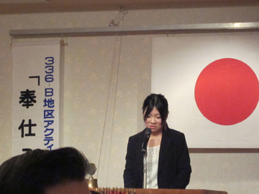 第750回例会(2011年2月24日セントイン倉敷)において冬季YE生帰国報告会が行われました、派遣学生はノンライオンで亀川真理さん。素晴しい体験をされ人間として一段と成長されたように思いました。「くらしき作陽大学」音楽部和楽器専攻の学生で、日本古来の文化(今勉強をしている和楽器等)を伝えた様子をプロジェクターでの報告がありました。そしてイタリアの文化を学び、またイタリアに行きたいとのこと、こういったチャンスを与えた倉敷西LCに対して感謝の言葉があり、お母さんからもお礼の挨拶がありました。YE事業の素晴しさを改めて痛感しました。グローバル化が進む中、更に交流を図り将来の日本の担い手として成長してもらえればと思います。 国際協調・青少年教育指導李院長 佐藤美恵子 |
