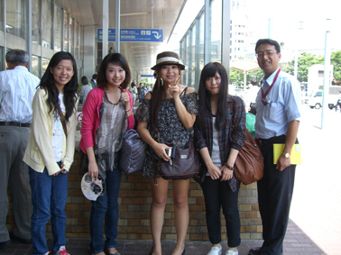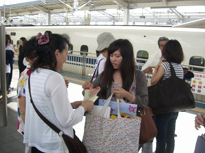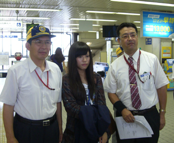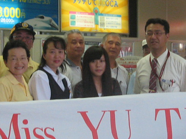 | 新倉敷駅でメンバー出迎え全員で記念撮影 | 新倉敷駅でMis YU TING WEIを迎える田野会長 |