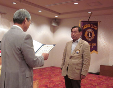 | 8月11日例会(セントイン倉敷)で西崎哲一さんがLCIF17回目の特別表彰(MJF伝達)を受けました。 |