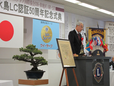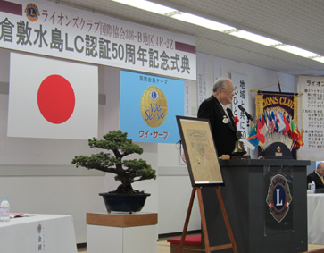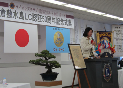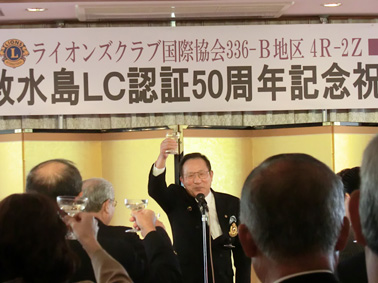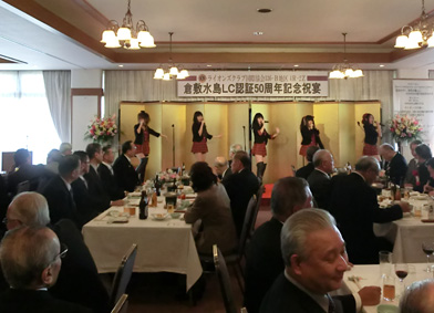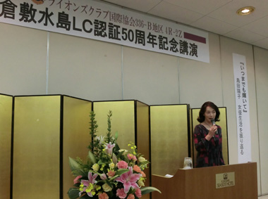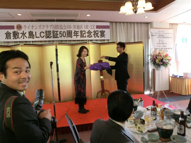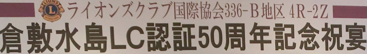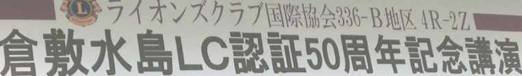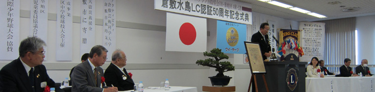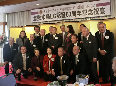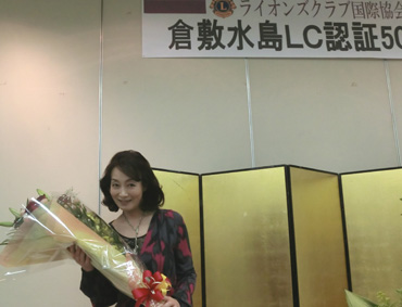 倉敷水島ライオンズクラブ認証50周年記念式典が11月20日「倉敷シーサイドホテル」で行われました。来賓として伊東倉敷市長・連島中学校長・水島地区民生委員児童委員協議会会長・ライオンズ関係者は336B地区金岡ガバナーを始め地区役員並びにブラザークラブのメンバーが「倉敷シーサイドホテル大ホール」に集結しました。東日本大震災の冥福と物故ライオンに対し黙祷をしました。そして記念講演は「いつまでも輝いて」と題して女優の島田陽子さんの講演を聞き、楽しく懇親会をして、また逢う日までを歌い解散しました。
