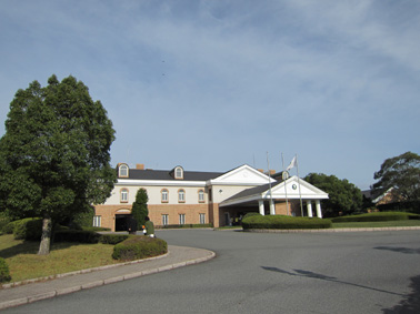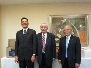 | 鷲羽GCクラブハウス | 表彰式に参加した 左から矢田部部会長、畑野ZC、荻原会長 |