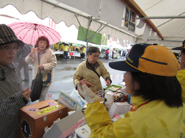 | 今年度「玉島ふるさと物産展」で事業資金獲得のためのtチャリティーバザーを行いました。 当日は一日雨で例年になくお客も低調でした。 メンバーが商品を持ち寄り大勢の市民に買ってもらいました、収益金は有意義な事業(青少年健全育成・YCE事業・福祉事業等々)に活用します (会長 畑直彦夫) |