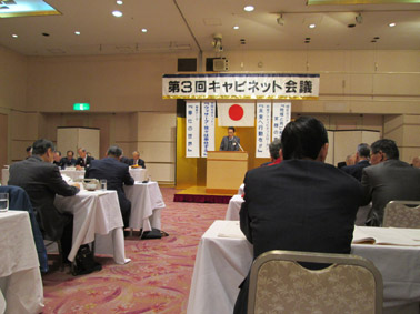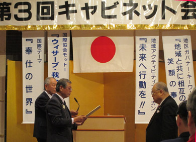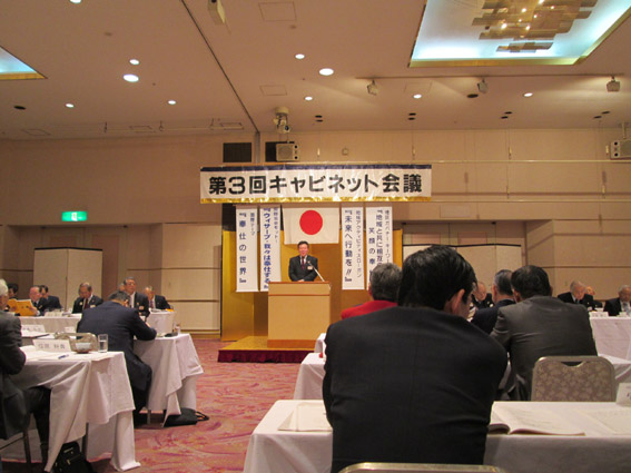 | 34代 336-B地区 第三回キャビネット会議が2013年1月19日12時より岡山ロイヤルホテルに於いて開催された。渡部ガバナーを始め、元ガバナー、地区役員が集結しました。ガバナー挨拶そして元ガバナーに対して前国際会長より「ビリーバー賞」表彰があり、議事に入りました。次期ガバナー候補、第一副地区ガバナー候補、第二副地区ガバナー候補の届出や推薦があり、地区年次大会について倉敷西LCの滝沢委員長から説明があり、伊澤会計より上半期会計報告、監査報告等あり、委員会報告や提案事項の説明があって有意義な質疑応答がありました。 |