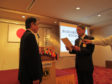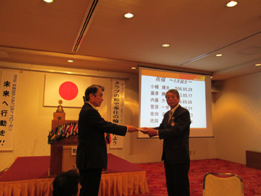 平成25年5月9日、年次大会に対して多額の支援を頂いたことに対して、803回例会で玉島信用金庫に渡部ガバナーより感謝状並びに玉島信用金庫から目録贈呈がありました。