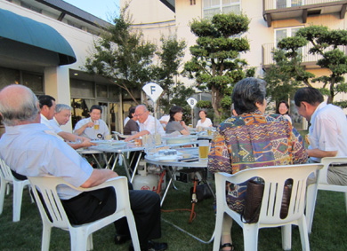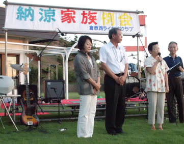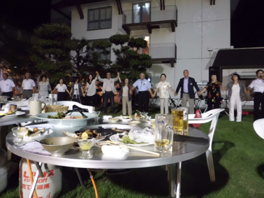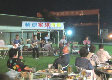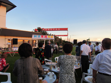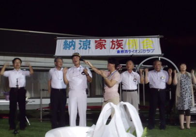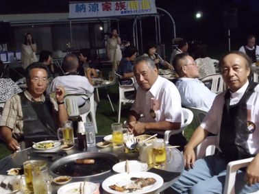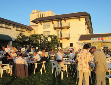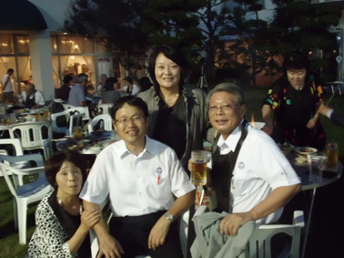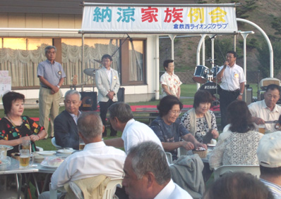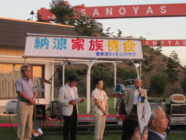 | 平成24年8月19日 倉敷西LC家族納涼例会を「倉敷シーサイドホテル」で行いました。 畑会長の方針で今年度の納涼例会は「倉敷シーサイドホテル野外焼肉パーティー」パートナー同伴(子どもは今年度中止)で開催しました。 第786回例会の後、パートナーと焼肉料理を囲み、イベントとして歌手や楽団で納涼懇親会を行いました。パートナーの協力があってのライオンズだと言う事を強く参加者に呼びかけて楽しい懇親会になりました,。 (計画委員長 矢吹知行) |