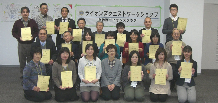 さる1月13〜14日、玉島交流センター2F会議室にて、ライオンズクエスト研修会が開催されました。玉島近辺の小中学校を対象に募集した所336B地区全般の小中学校の先生方、徳島の先生、岡山大学大学院の教育学部の先生、ライオンズ関係も鳥取青少年健全育成委員を含め総勢21人でした。我が倉敷西クラブからも矢田部さんが参加しました、学校側のクエストに対する理解の濃淡があり、この事業もこれからだと思います。ほんとに一歩づつですが、輪は拡がって行くと思います。