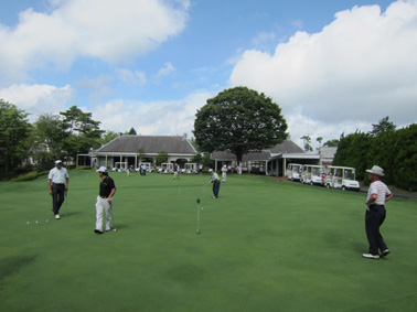 | パインツリークラブハウスをバックに練習グリーンにて |