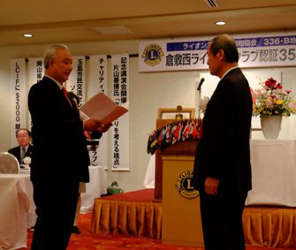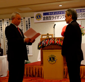 | 目録贈呈岡山県臓器バンクへ | 目録贈呈336B地区ガバナーへ | 倉敷市長祝辞 |
