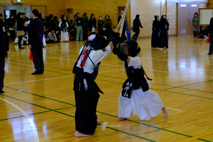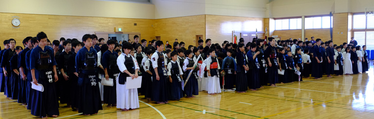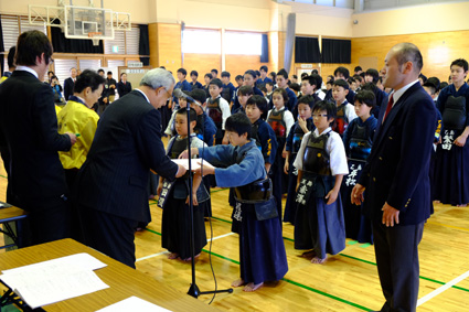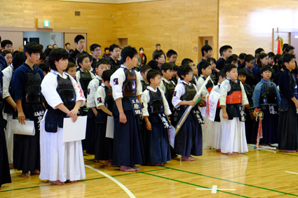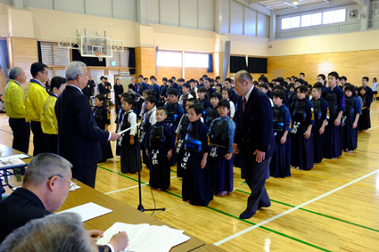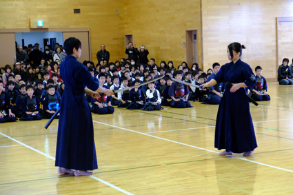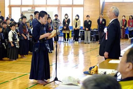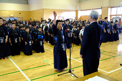 | 選手宣誓 | 模範演武と真剣に見る参加豆剣士達 |