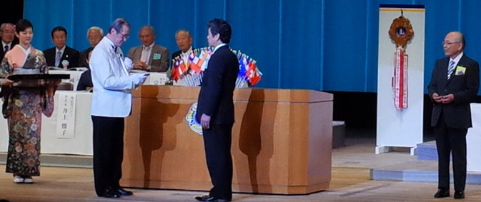 | 渡部前ガバナー国際会長より表彰 | 荻原前キャビネット幹事・伊澤会計・国際会長より表彰 |