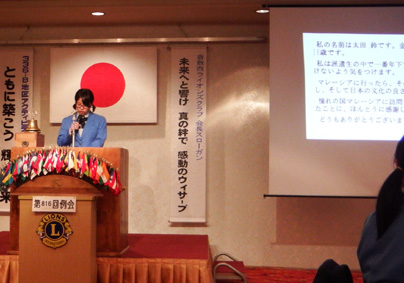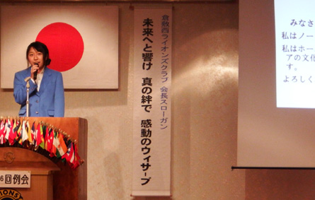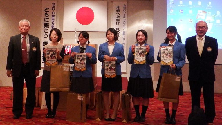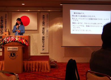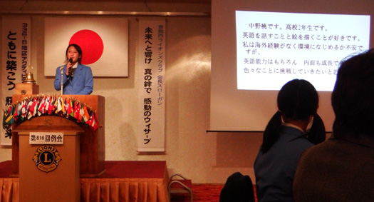 | 第816回例会(11月28日セントイン倉敷)で派遣生5名の壮行会を行いました、戸田YCE委員長による派遣生の紹介そして小林実行委員長挨拶、国富会長から激励の言葉と相手クラブ・ホストファミリーに対しての贈り物「バナー・バッチ等」、を渡して各派遣生は英語による自己紹介や思いを発表しました、尚当日は保護者同伴で出席しました、それぞれ保護者も挨拶されました。。 |