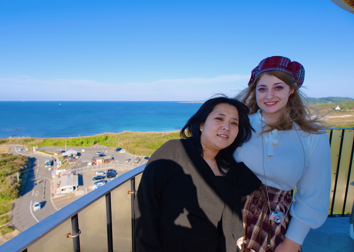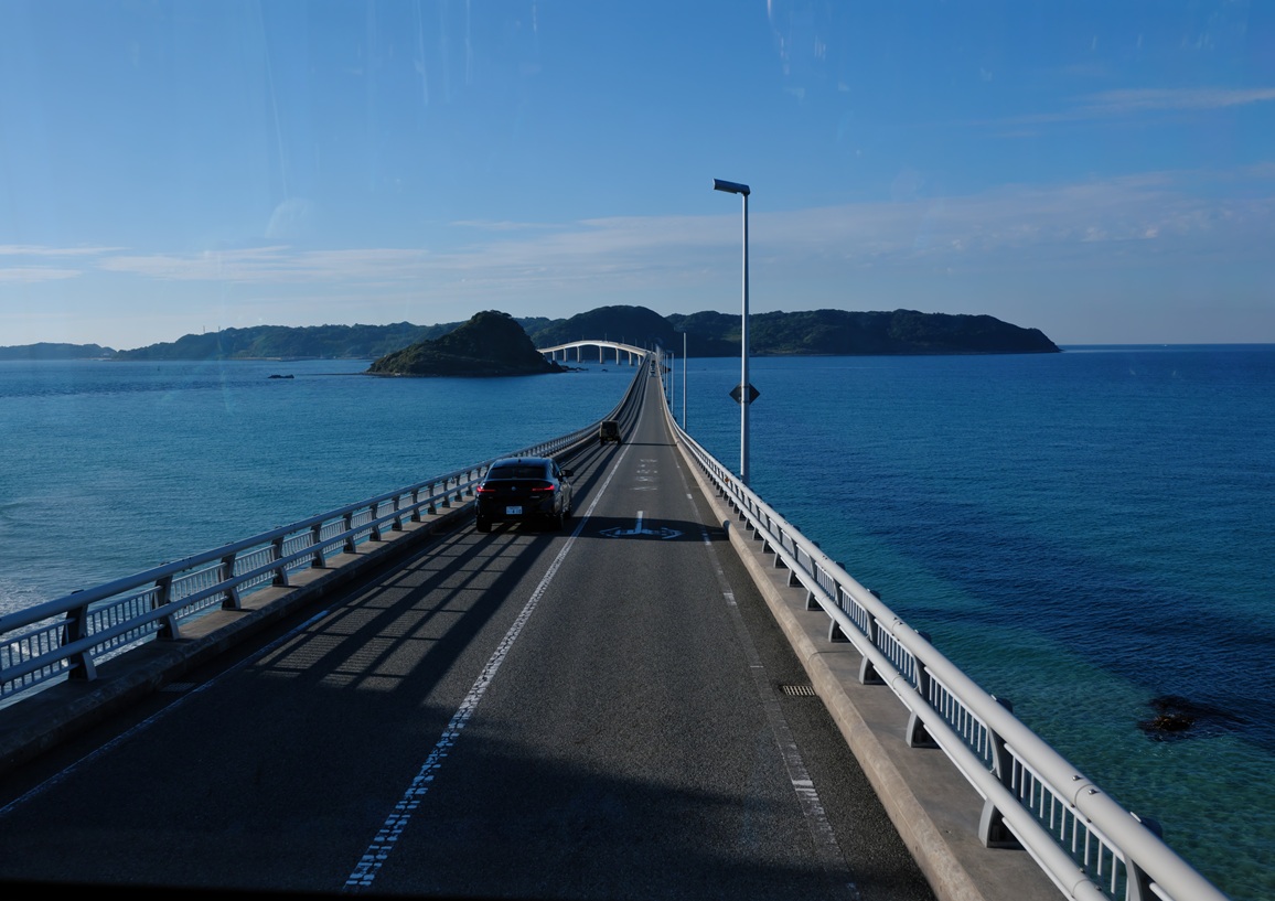 下関では、名物のふぐ刺しなどいただきお酒も入り楽しく歓談しました。そして次の目的地である角島大橋に向けて瀬戸内海から日本海を北上し角島へむかいました。角島大橋を走っていると下に見える水がきれいで海底が透けて見えます。また角島灯台からは日本海を一望できました。そして宿泊地である油谷温泉に向かいました。