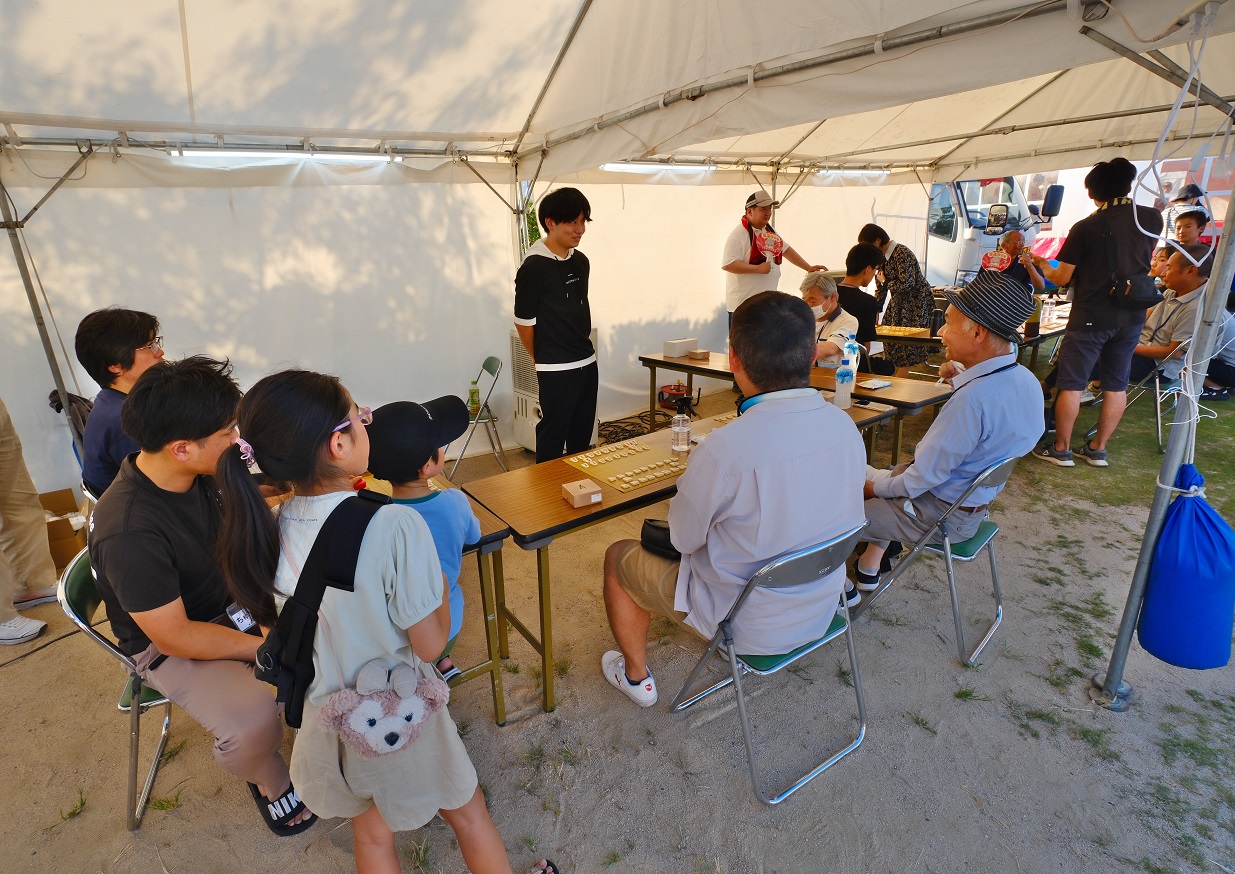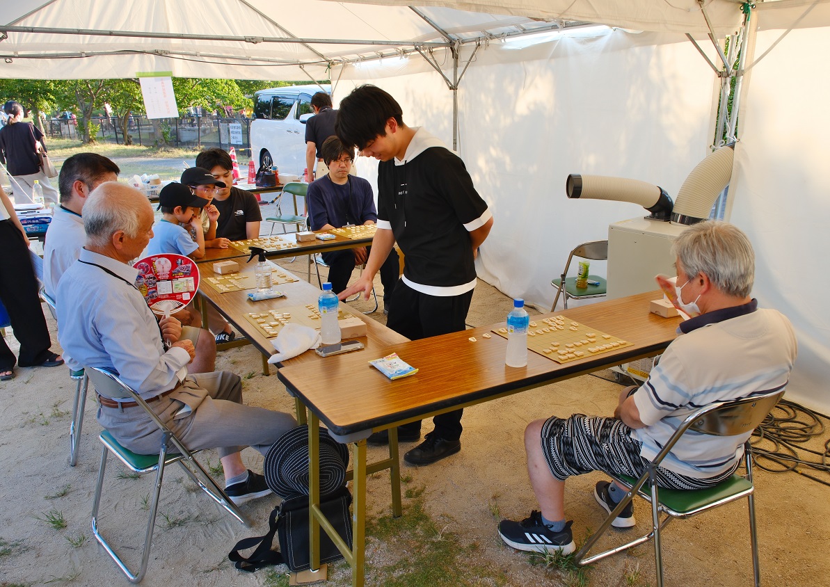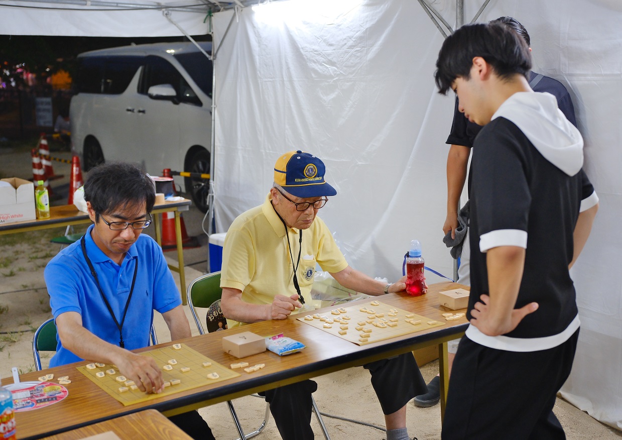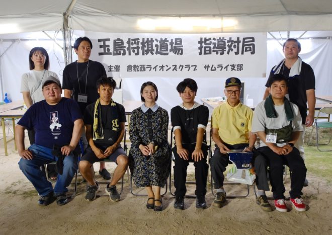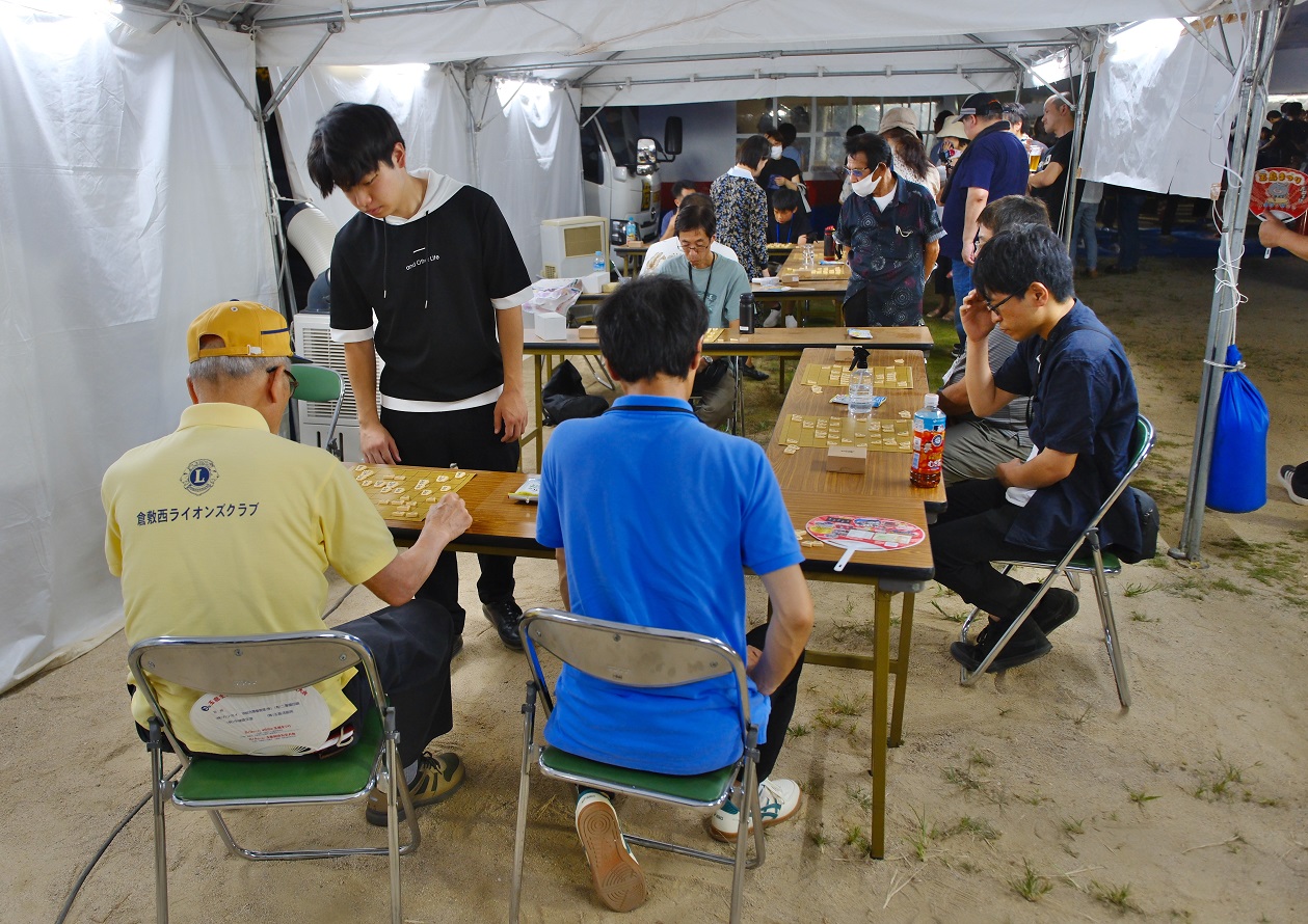 倉敷西ライオンズクラブでは、まつり内のイベントとして、サムライ支部主催で新倉敷駅南公園に「玉島将棋道場 指導対局」ブースを構えました。