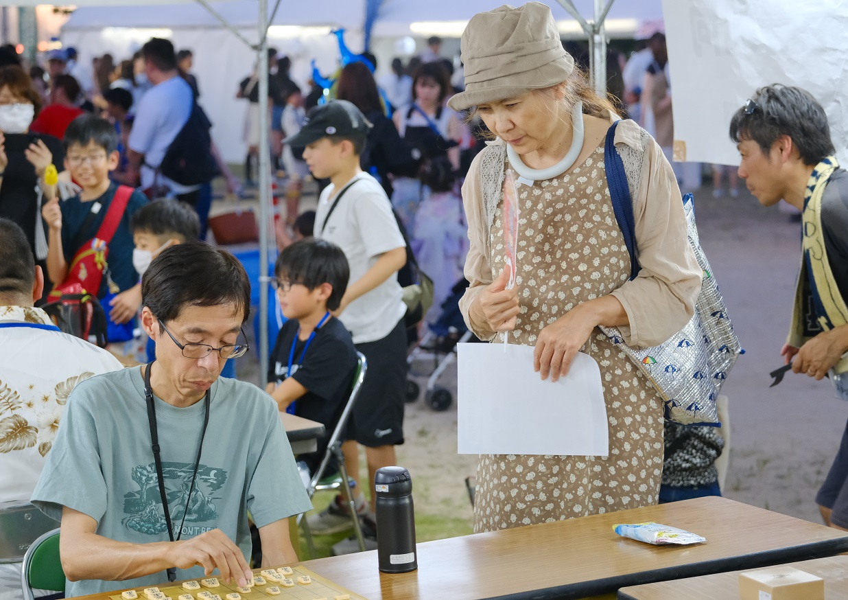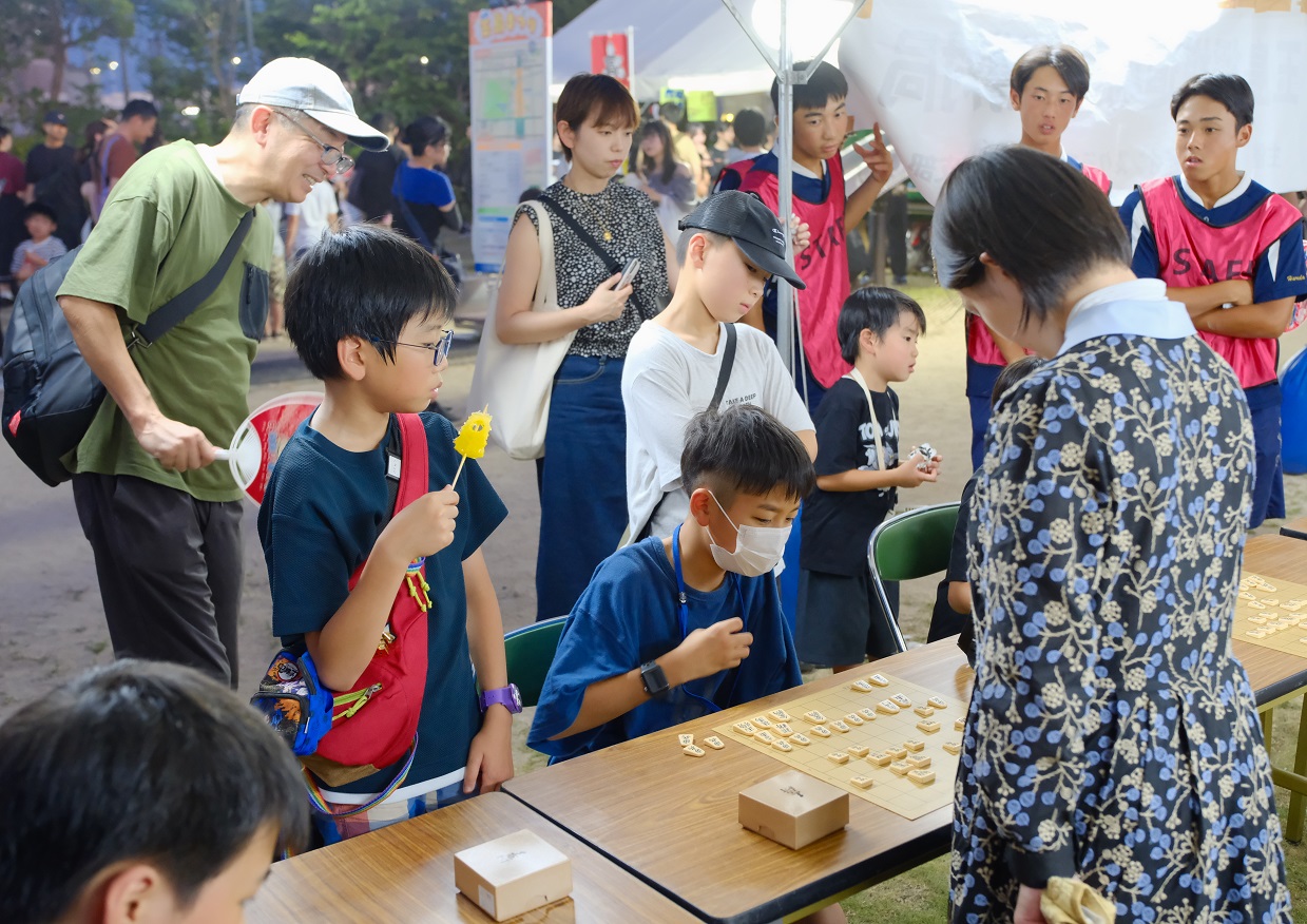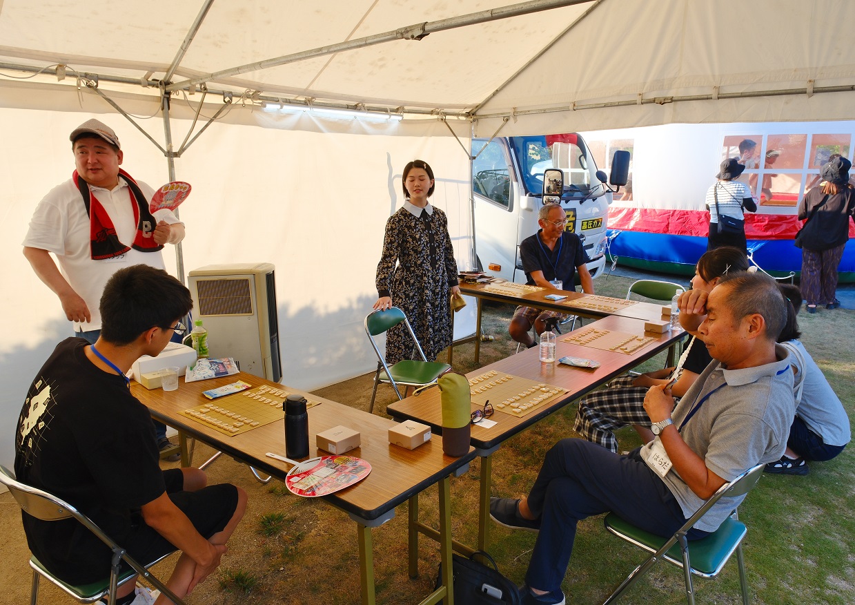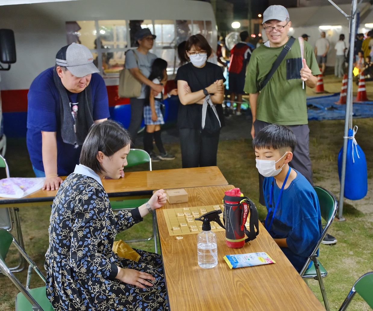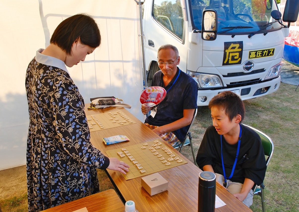 倉敷西ライオンズクラブでは、まつり内のイベントとして、サムライ支部主催で新倉敷駅南公園に「玉島将棋道場 指導対局」ブースを構えました。